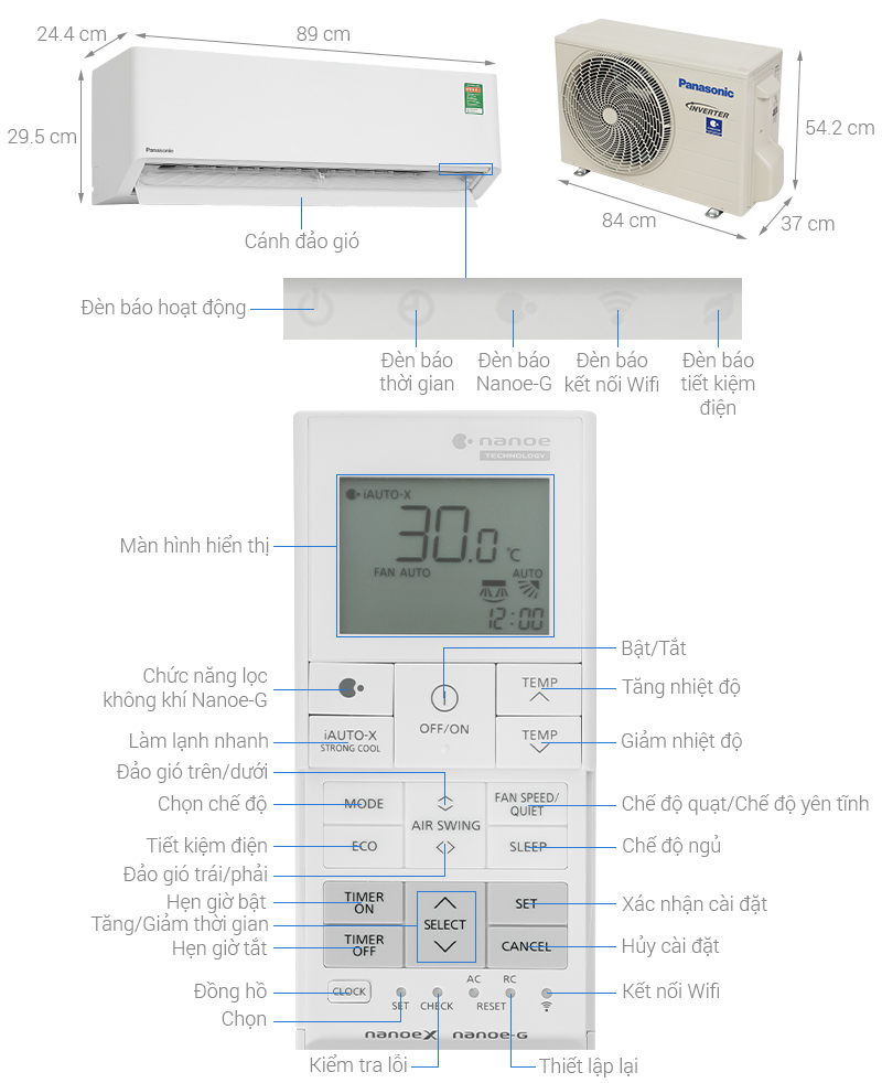 -Dàn lạnh: Máy lạnh Panasonic một chiều thuộc loại máy lạnh treo tường tiện lợi, có thiết kế vuông vức kết hợp gam màu trắng thanh lịch, dễ dàng lắp đặt và bố trí trong nhiều phong cách nội thất khác nhau.