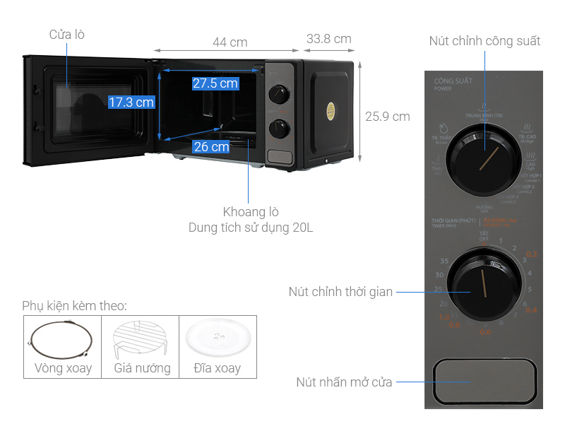 Kích thước khoang lò: Ngang 27.5 cm – Cao 17.3 cm – Sâu 26 cm
