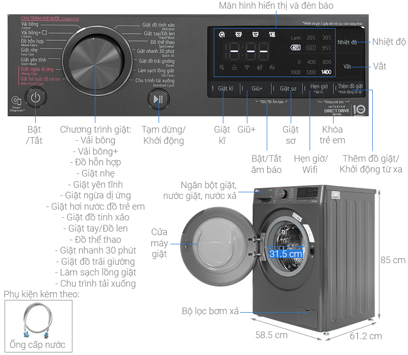 – Điều khiển từ xa qua ứng dụng LG ThinQ: giúp bạn có thể điều khiển máy từ xa thông qua wifi, tải xuống thêm nhiều chương trình khác nhau, gửi thông báo khi máy gặp sự cố,…