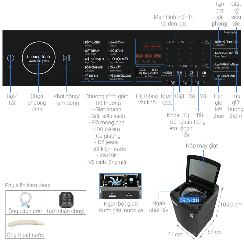 – Ngoài ra còn có các tiện ích khác như: hẹn giờ giặt, khóa trẻ em,…