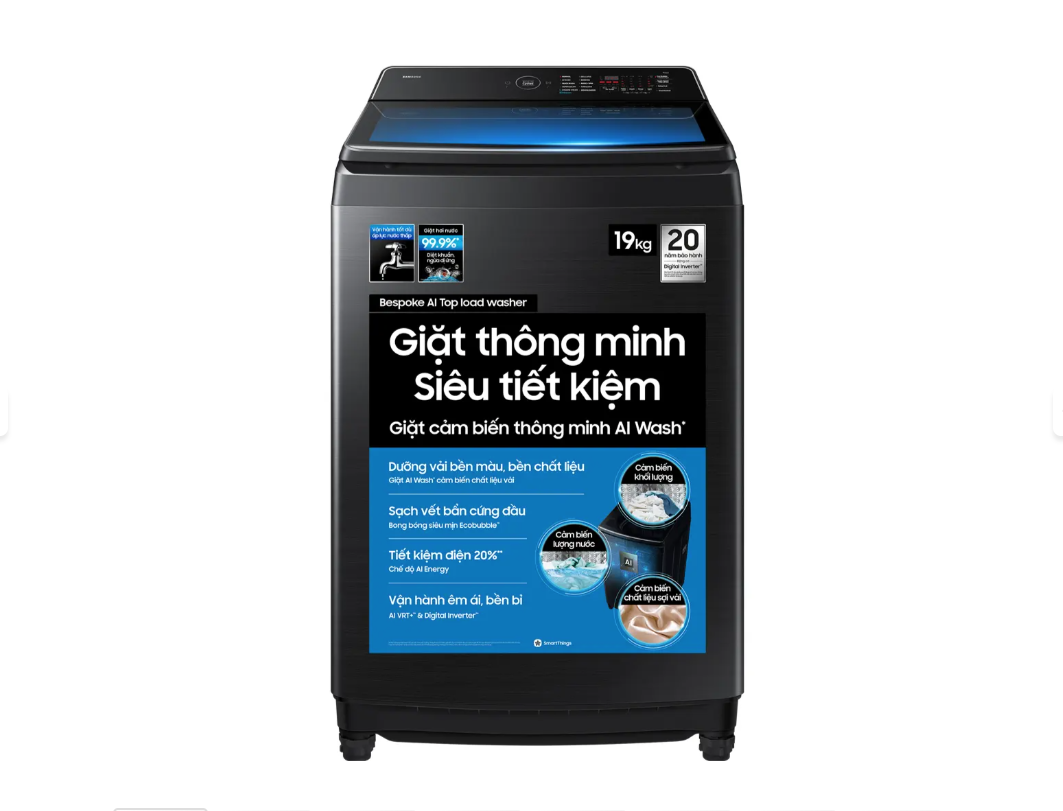 Máy giặt Samsung Inverter 19 kg WA80F19B9BSV là lựa chọn lý tưởng cho gia đình đông người nhờ khối lượng giặt lớn cùng công nghệ giặt mạnh mẽ, kháng khuẩn và tiết kiệm điện. Với tính năng điều khiển thông minh qua ứng dụng SmartThings, công nghệ Eco Bubble, giặt hơi nước Hygiene Steam và AI Wash, mẫu máy cửa trên này mang đến hiệu quả giặt sạch sâu và tiện nghi tối ưu cho người dùng hiện đại.