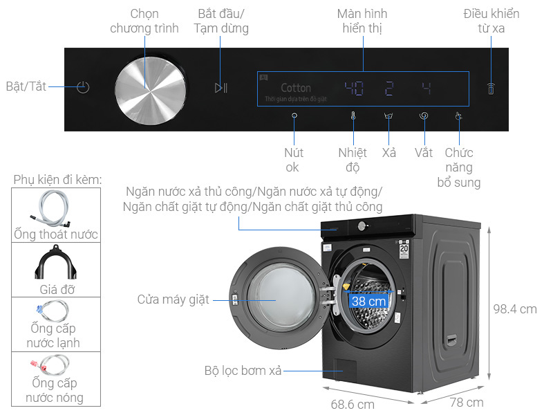 – Bảng điều khiển AI control tự động ghi nhớ chế độ giặt