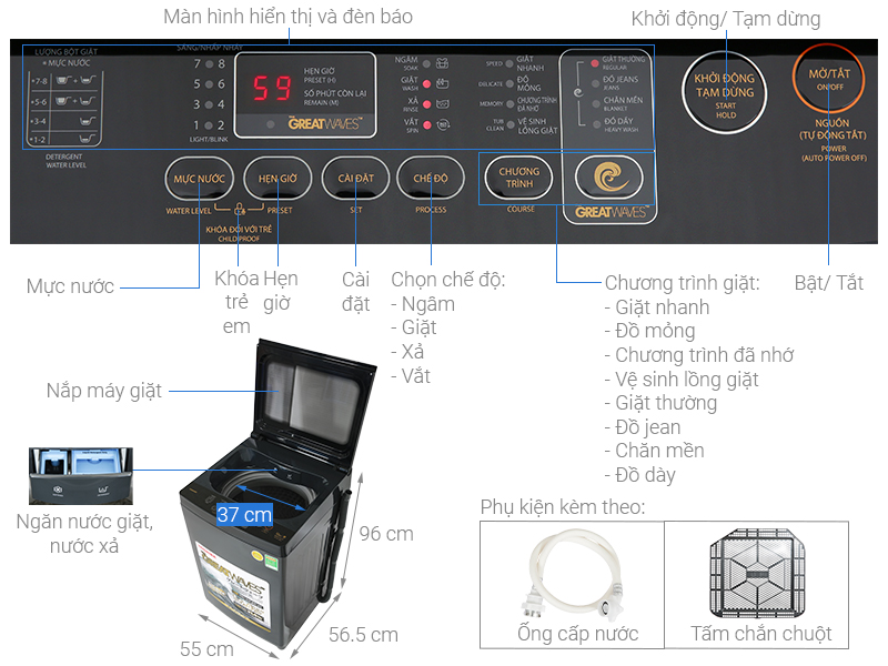 – Greatwaves kết hợp 3 luồng nước xoay ngang 2 chiều, đập xuống, phun từ dưới lên giúp quần áo được giặt sạch hơn, tiết kiệm thời gian, hạn chế hư tổn sợi vải.