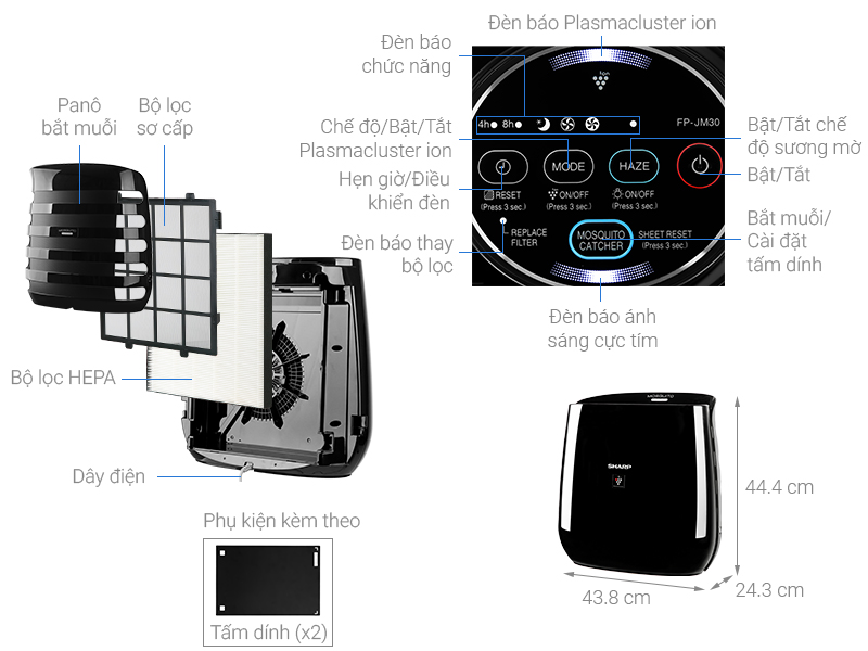 Tiện ích: Plasmacluster Ion mật độ cao tiêu diệt nấm mốc trong không khí, khử mùi thuốc lá, phấn hoa, Lọc được bụi mịn PM 2.5, Đèn báo thay bộ lọc, Bắt muỗi bằng đèn UV, Lọc nhanh với chế độ Haze, Tự khởi động lại, Hẹn giờ tắt