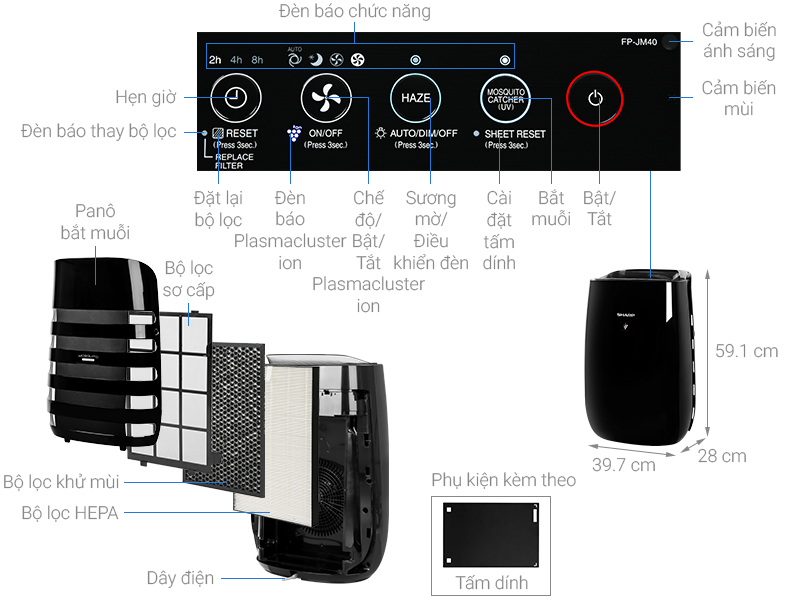 Tiện ích: Plasmacluster Ion mật độ cao tiêu diệt nấm mốc trong không khí, khử mùi thuốc lá, phấn hoa, Lọc được bụi mịn PM 2.5, Đèn báo thay bộ lọc, Bắt muỗi bằng đèn UV, Lọc nhanh với chế độ Haze, Tự khởi động lại, Hẹn giờ tắt