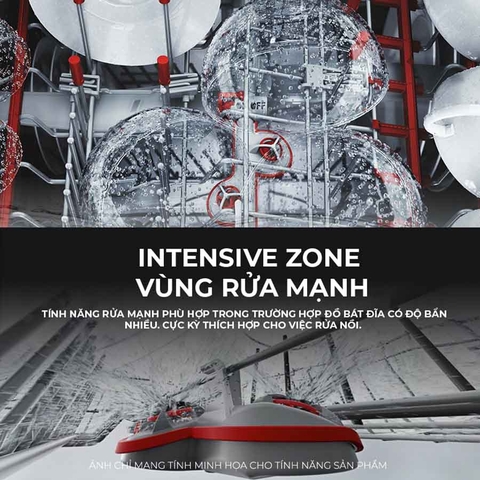 Tại khu vực này, áp lực nước và nhiệt độ sẽ được tăng lên để làm sạch tốt hơn. Nhờ vậy xoong nồi, chảo, khay bẩn được làm sạch toàn bộ vết bẩn, trong khi bát đĩa hay ly cốc ở ngăn trên vẫn được rửa nhẹ nhàng.