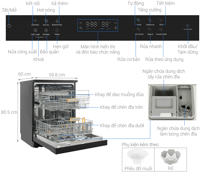 – Máy rửa bát có thiết kế 2 khay rửa: khay trên và khay dưới.