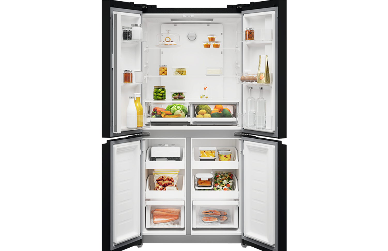 Tủ lạnh Electrolux 4 cánh mở độc lập kiểu cửa Pháp cực kỳ tiện lợi với ngăn lạnh siêu rộng, dễ dàng lưu trữ những thực phẩm có kích thước bề ngang lớn. Trong khi đó ngăn đá được chia thành nhiều hộc nhỏ giúp bảo quản riêng từng loại thực phẩm khác nhau, ngăn lẫn mùi.