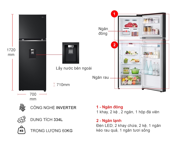 – Tủ lạnh có dung tích sử dụng 334 lít, phù hợp với các gia đình có từ 3 – 4 người.