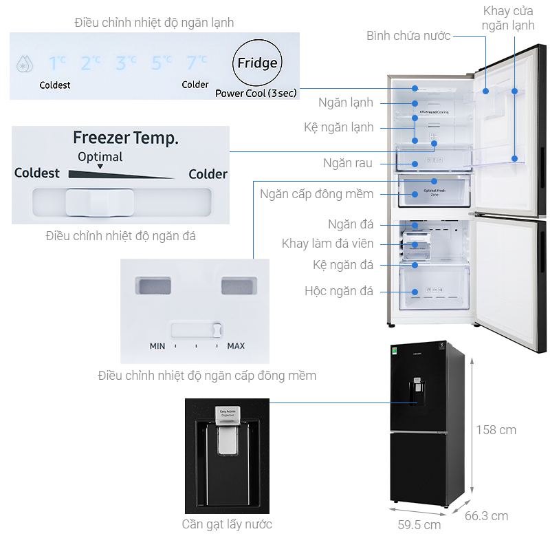 Tiện ích: Bảo quản thịt cá không cần rã đông, Làm lạnh nhanh, Hộp đá xoay di động, Inverter tiết kiệm điện, Lấy nước bên ngoài