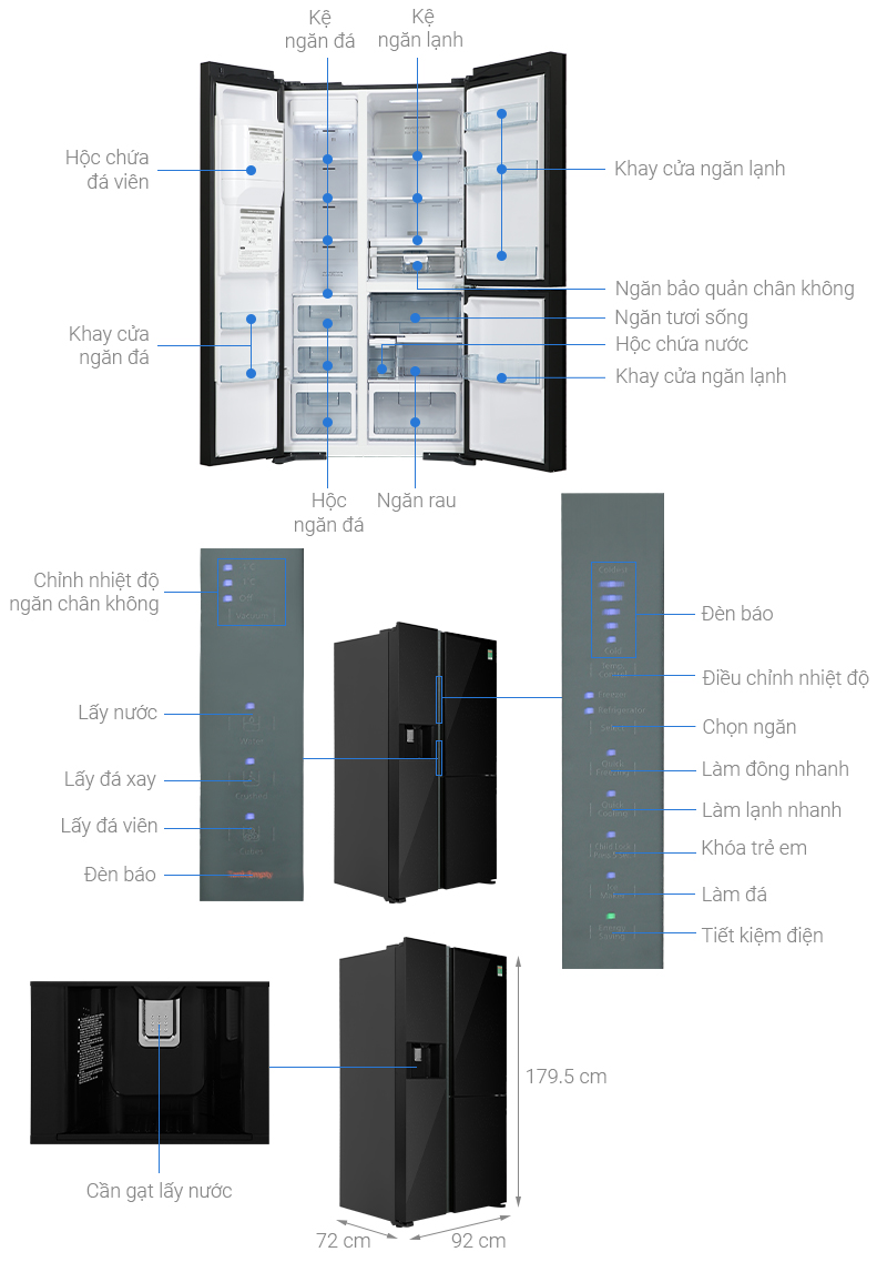 – Bảng điều khiển màn hình LED tích hợp cảm ứng cho bạn tùy chỉnh các chế độ dễ dàng, chuẩn xác tùy theo nhu cầu của mình. – Chuông báo khi quên đóng cửa giúp tiết kiệm điện, tránh làm thất thoát hơi lạnh.
