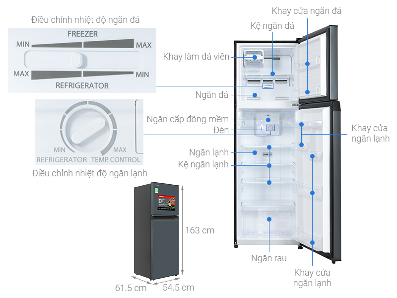 – Dung tích ngăn đá được thiết kế lớn 61 lít, gồm có 1 hộp làm đá, 1 kệ chia làm 2 ngăn và 2 khay chứa ở phía bên cánh cửa tủ.