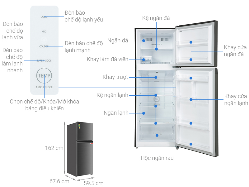 🔺 Kích thước tủ lạnh: Cao 162 cm – Rộng 59.5 cm – Sâu 67.6 cm – Nặng 54 kg