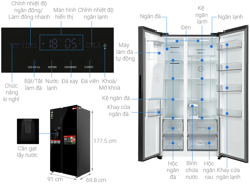 🔺 Kích thước – Khối lượng: Cao 177.5 cm – Ngang 91 cm – Sâu 69.8 cm – Nặng 105 kg
